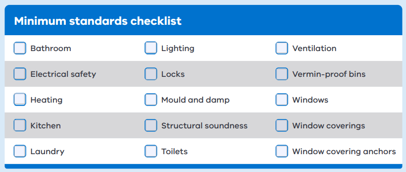 Minimum standards are legislated requirements that rental properties must meet before being advertised or leased in Victoria.